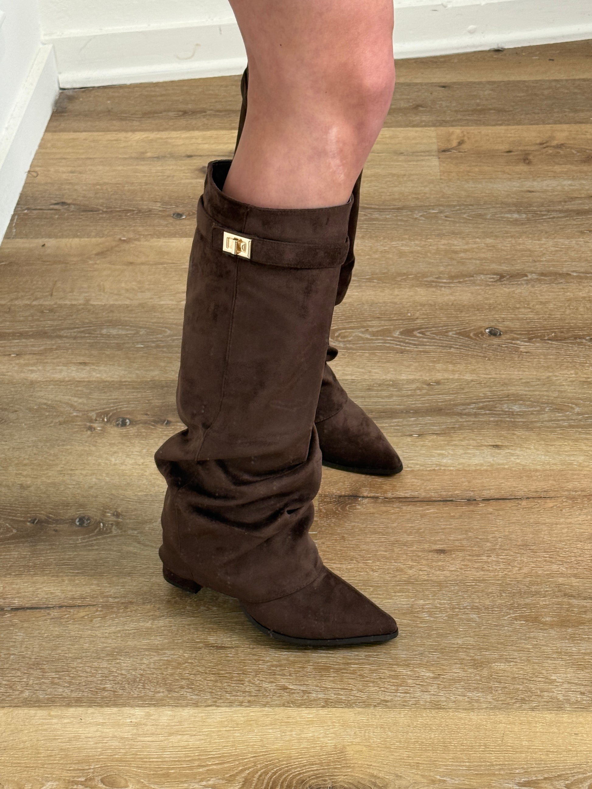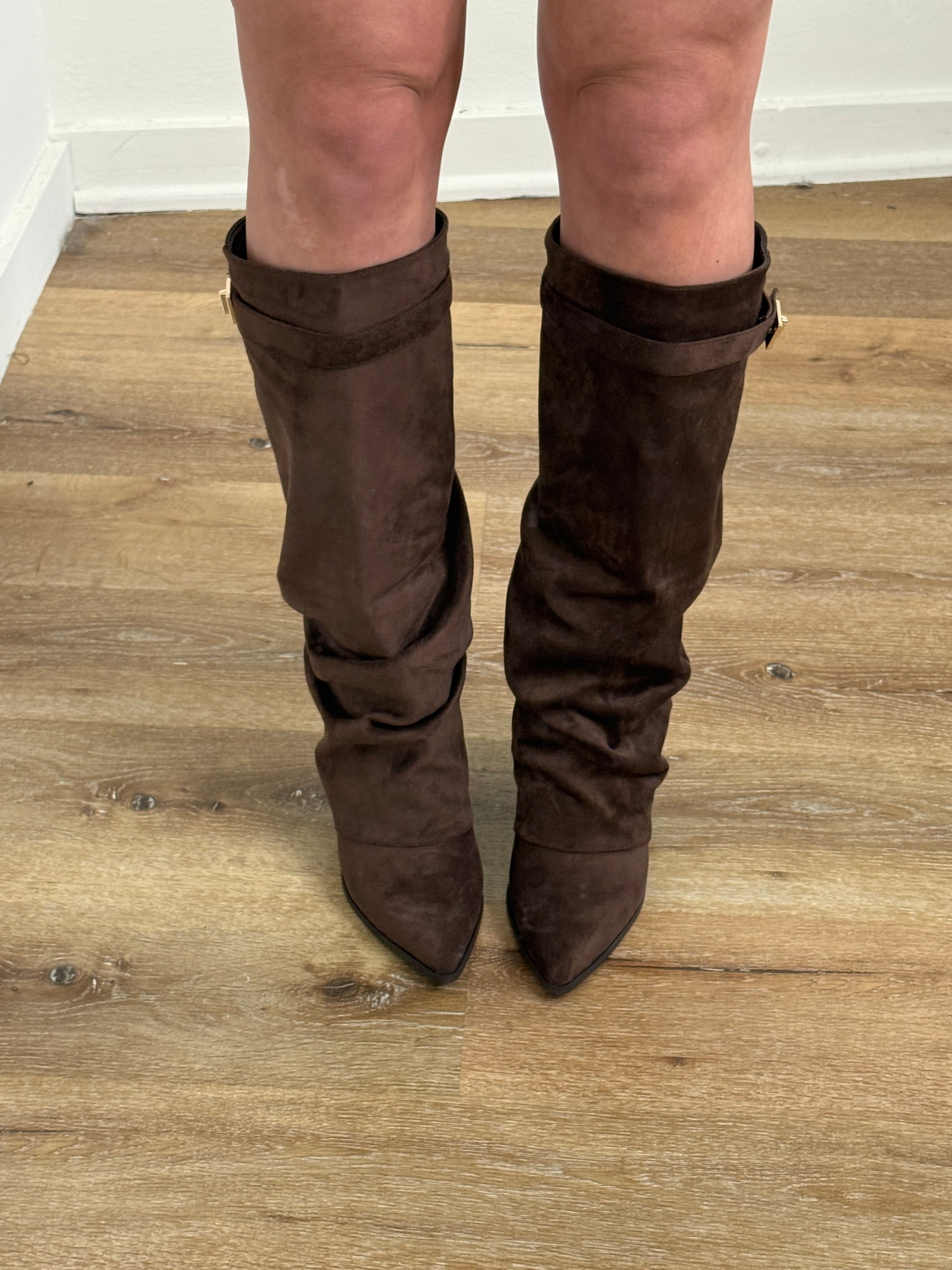 Stijlvolle knielaarzen in suèdelook met subtiele plooidetailing en goudkleurige gesp. Voorzien van een puntige neus en een comfortabele blok hak van 5 cm.