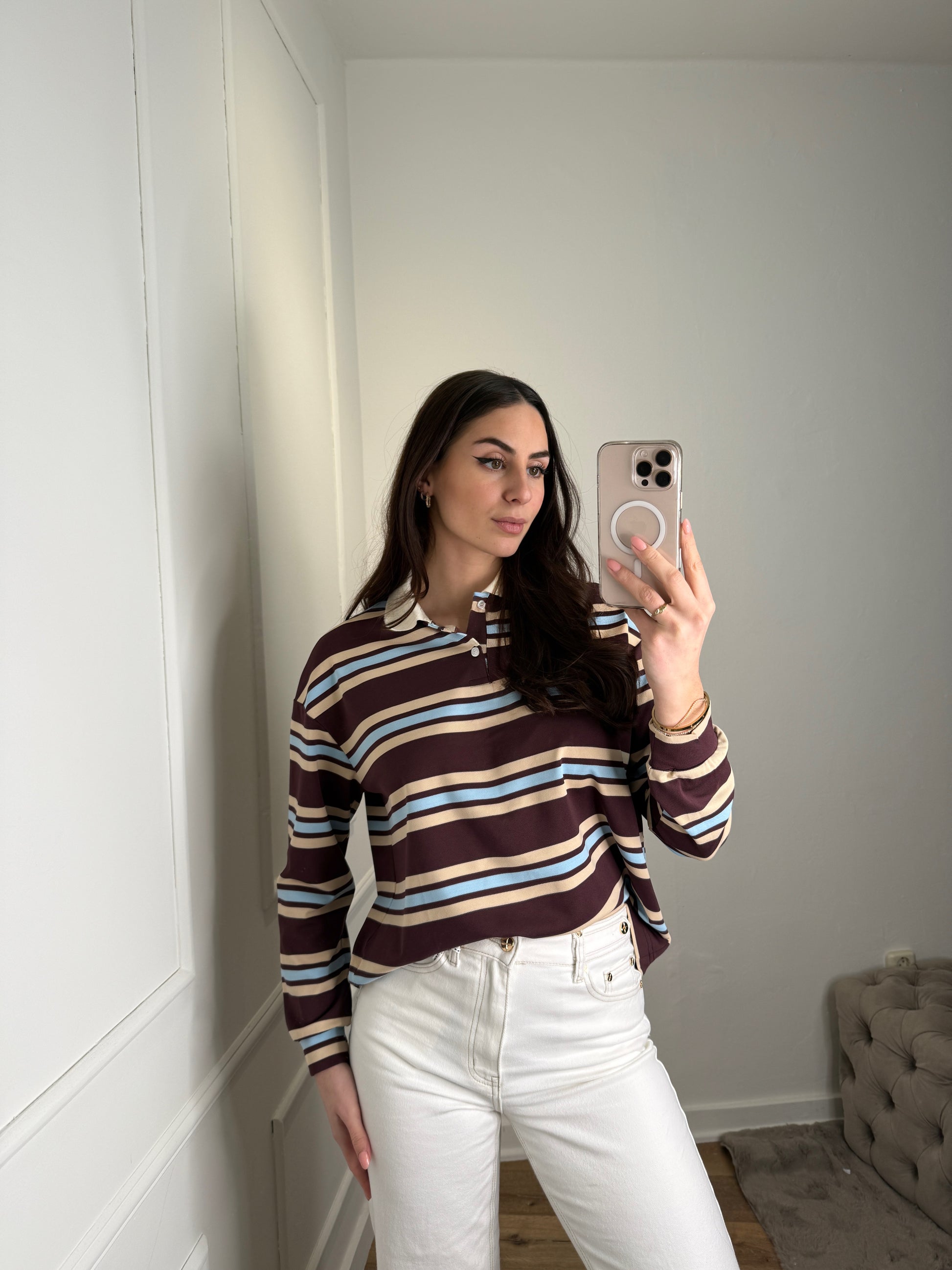 Deze gestreepte polo top is een tijdloos item met een sportieve, vrouwelijke uitstraling. Het klassieke kraagje en de horizontale strepen geven de top een moderne twist. De zachte, comfortabele stof maakt dit item ideaal voor dagelijks gebruik. Mooi te combineren met een jeans of pantalon voor een effortless, stijlvolle look.