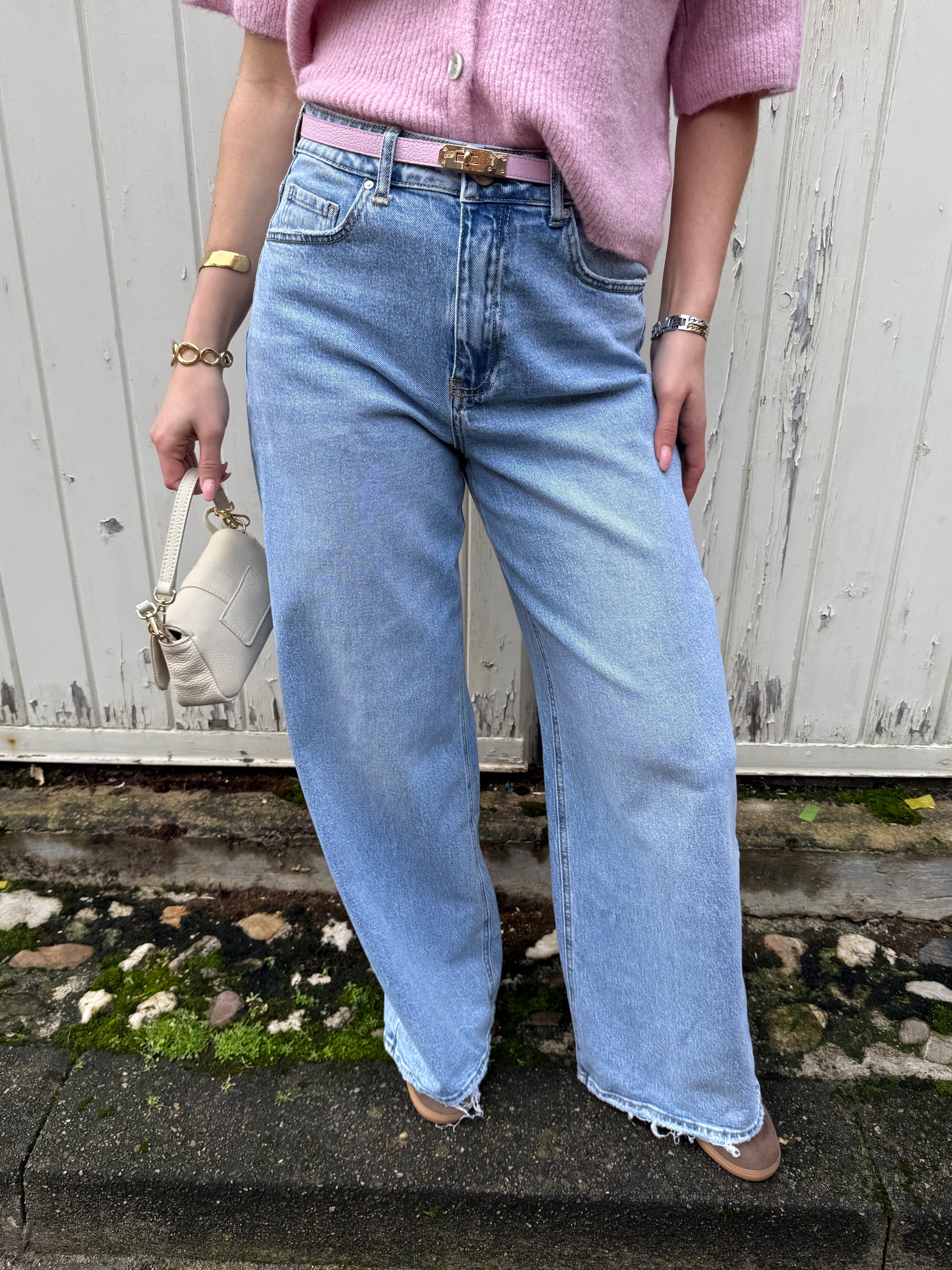 High waisted jeans met wijde pijpen en een rechte, flatterende fit. Gemaakt van stevig denim met een lichte wassing en klassieke 5-pocket details. Sluit met knoop en rits.