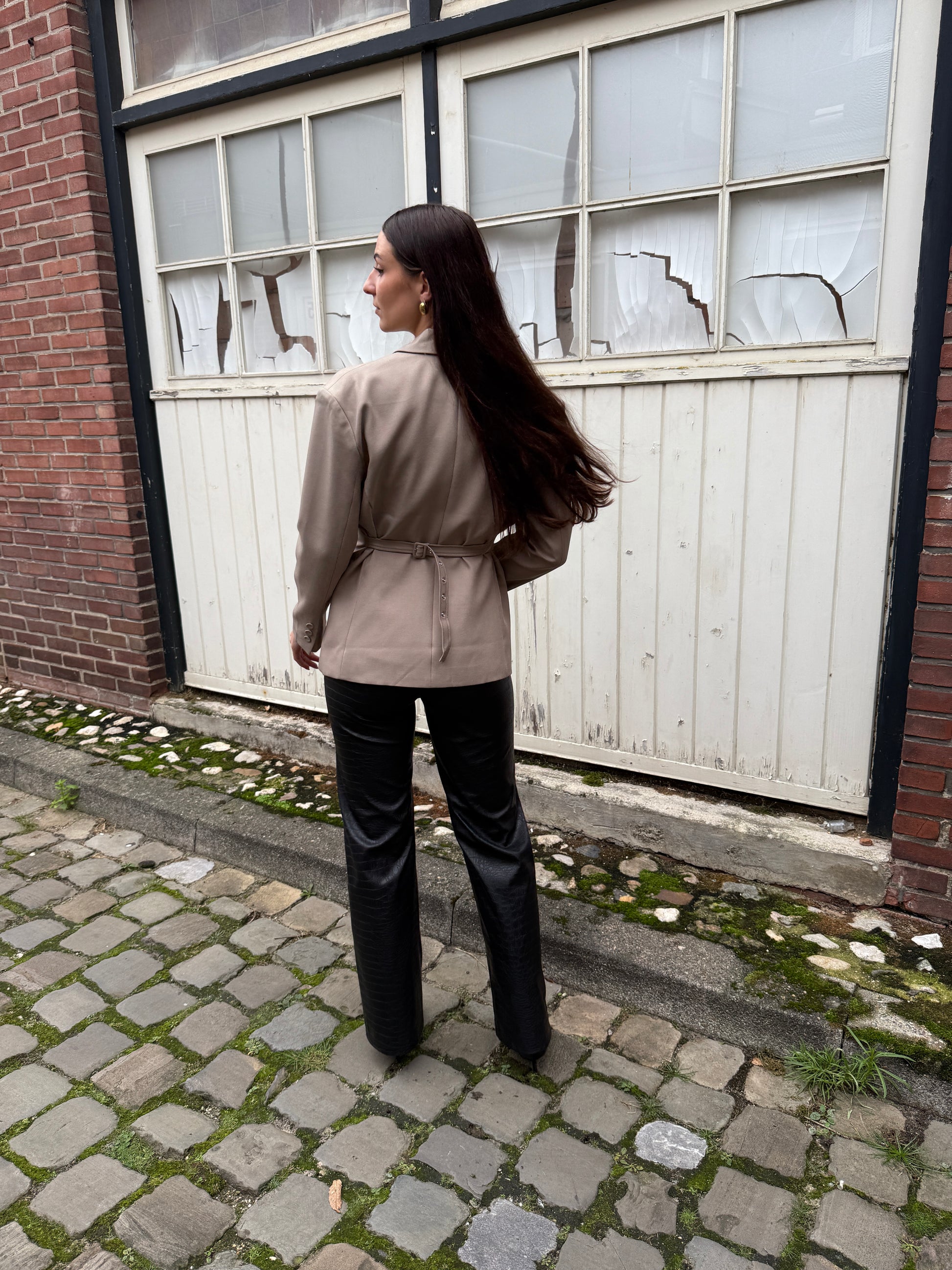 Prachtige stevige blazer met schoudervulling. Een getailleerde blazer die aan de achterkant een riempje heeft waarmee je de blazer kan verstellen. Sluit dmv twee knopen.