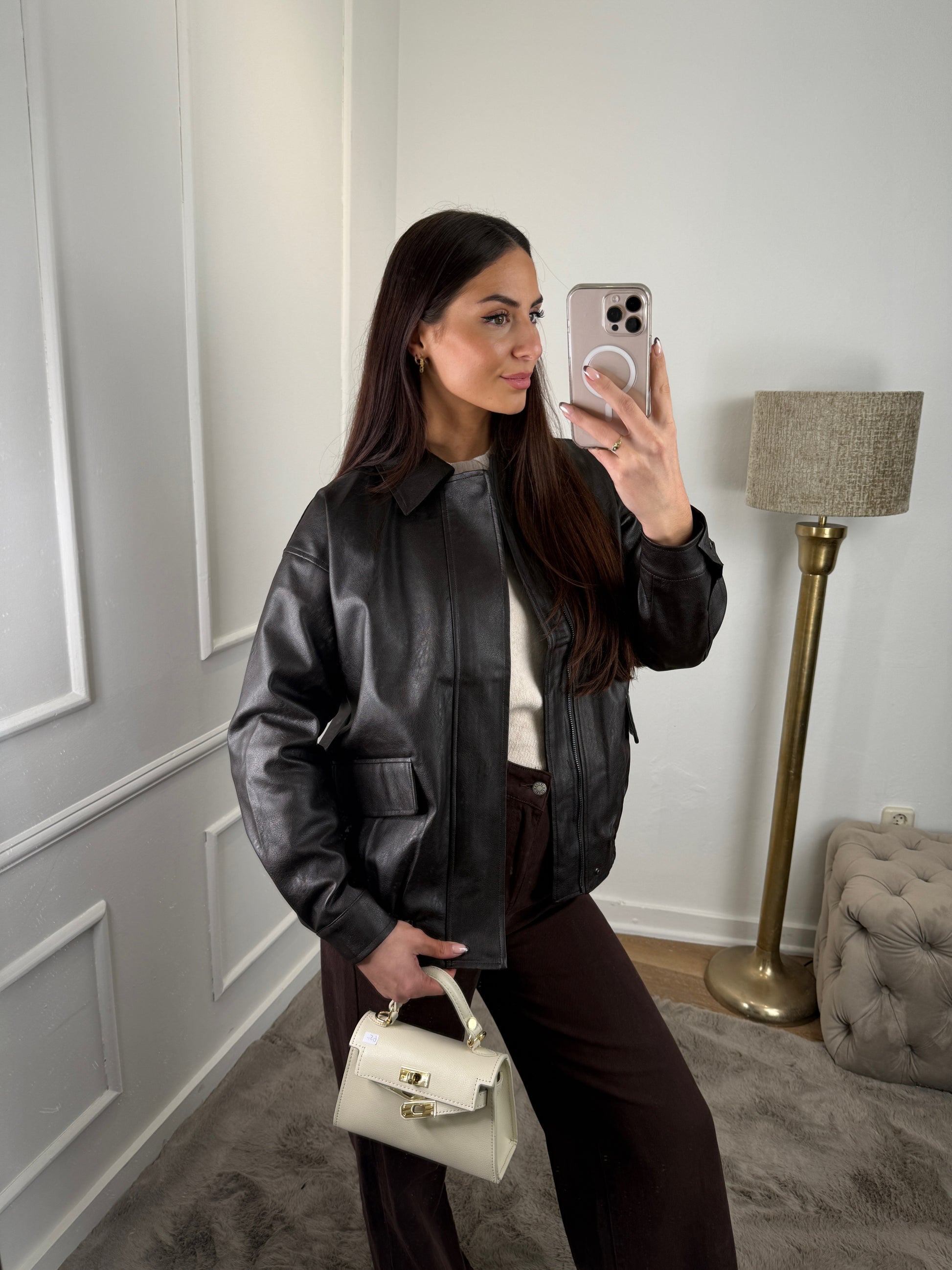 Prachtige faux leren bomber jacket met een donker bruine wassing.