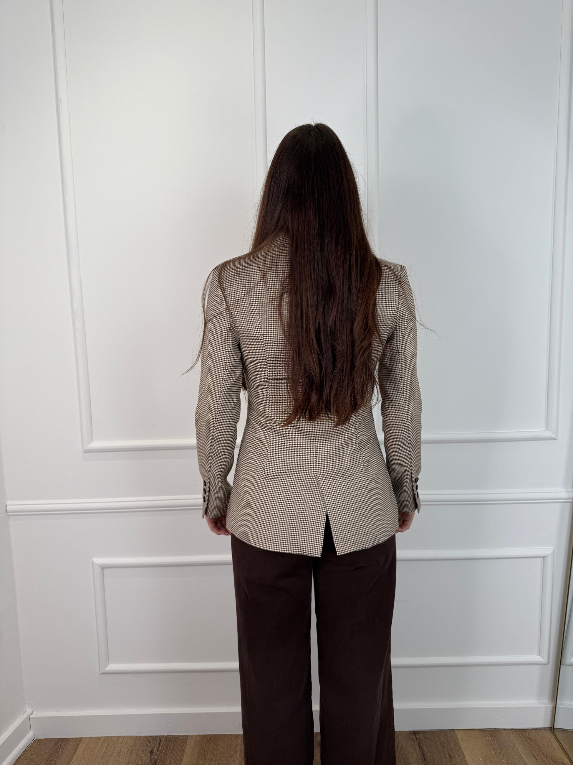Geruite blazer. Bruin/beige. Knoop aan de binnenkant en aan de buitenkant. Met een kleine slot aan de achterkant.