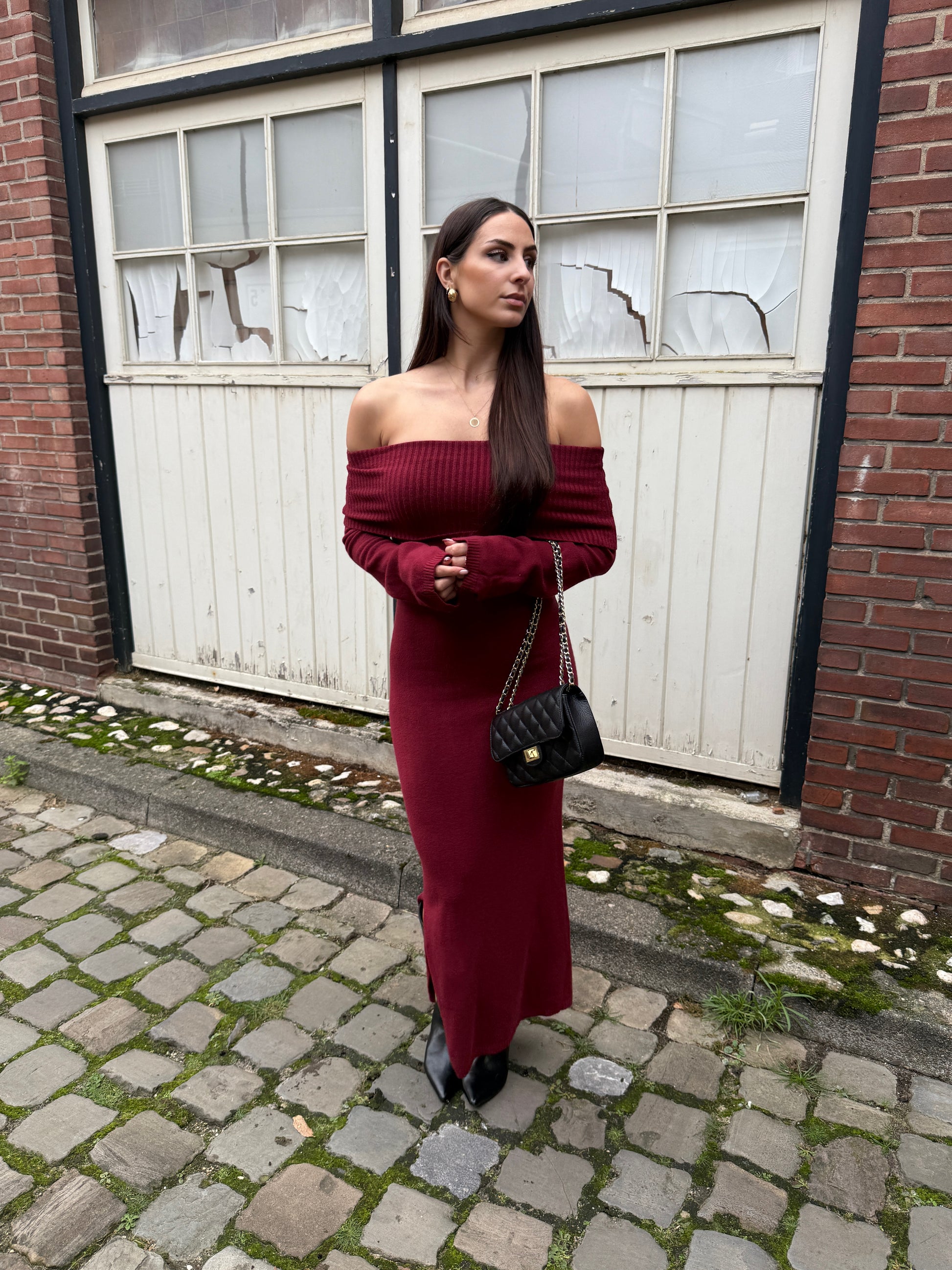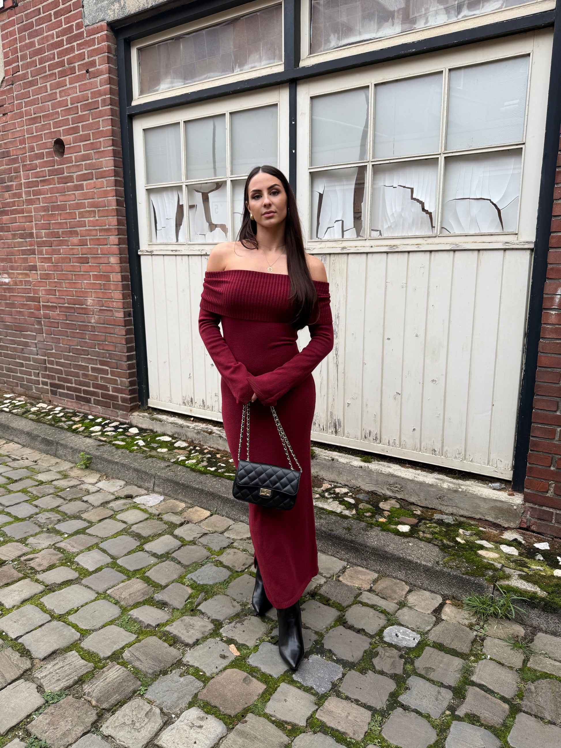 Een off-shoulder knit dress met kleine split aan de zijkant en uitlopende mouwtjes. Verkrijgbaar in drie kleuren. Gecombineerd met onze leerlook kitten heel laarzen en de Sophie tas zwart. Ook perfect voor als je zwanger bent!