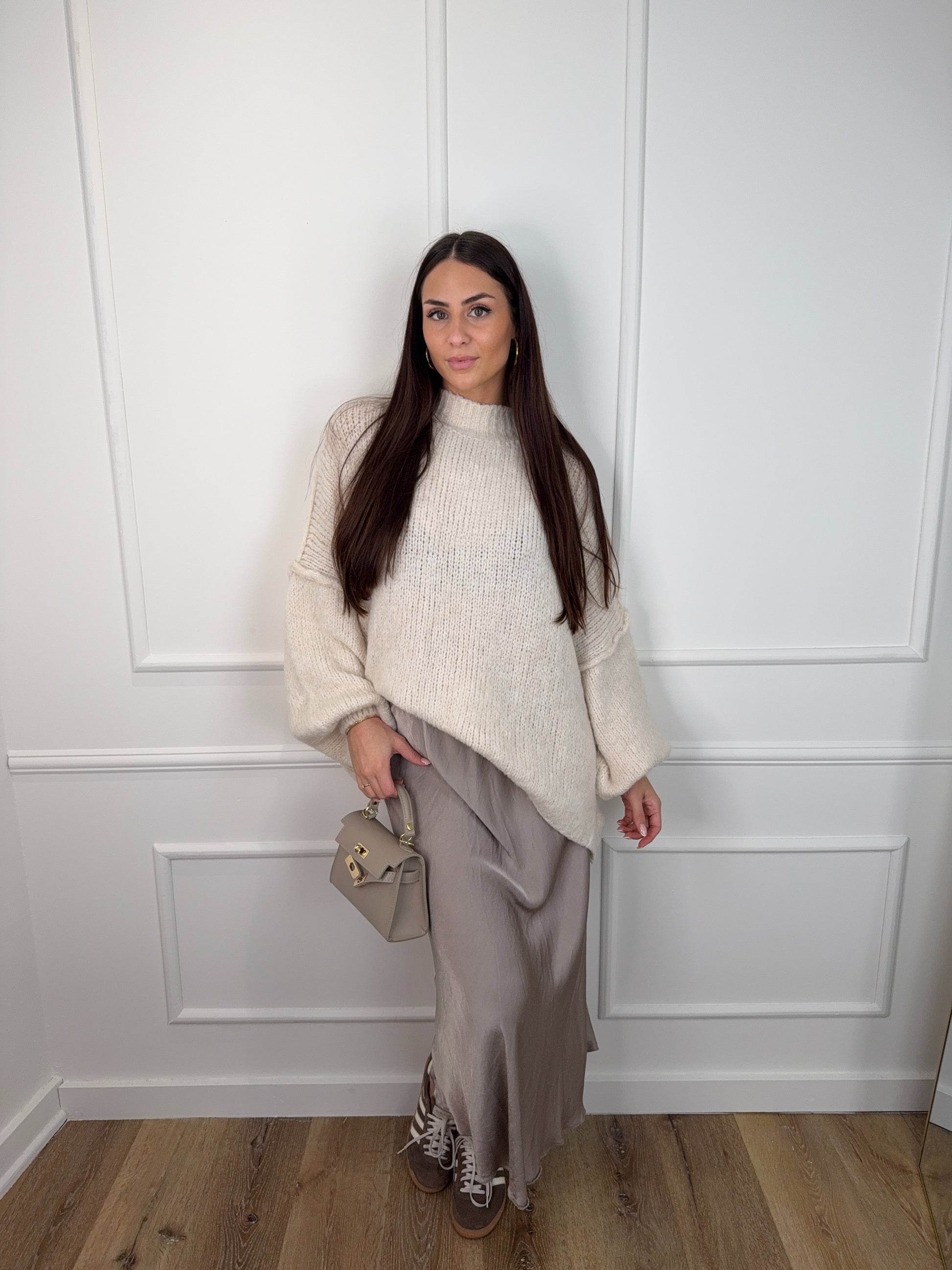 De trui is heerlijk lang, dik en past bij elke outfit. Als detail heeft de trui op de mouwen een dik geborduurde naad. Ook bevat de trui pofmouwen en is de trui wat hoger in de hals, perfect voor de komende ''cozy days''.