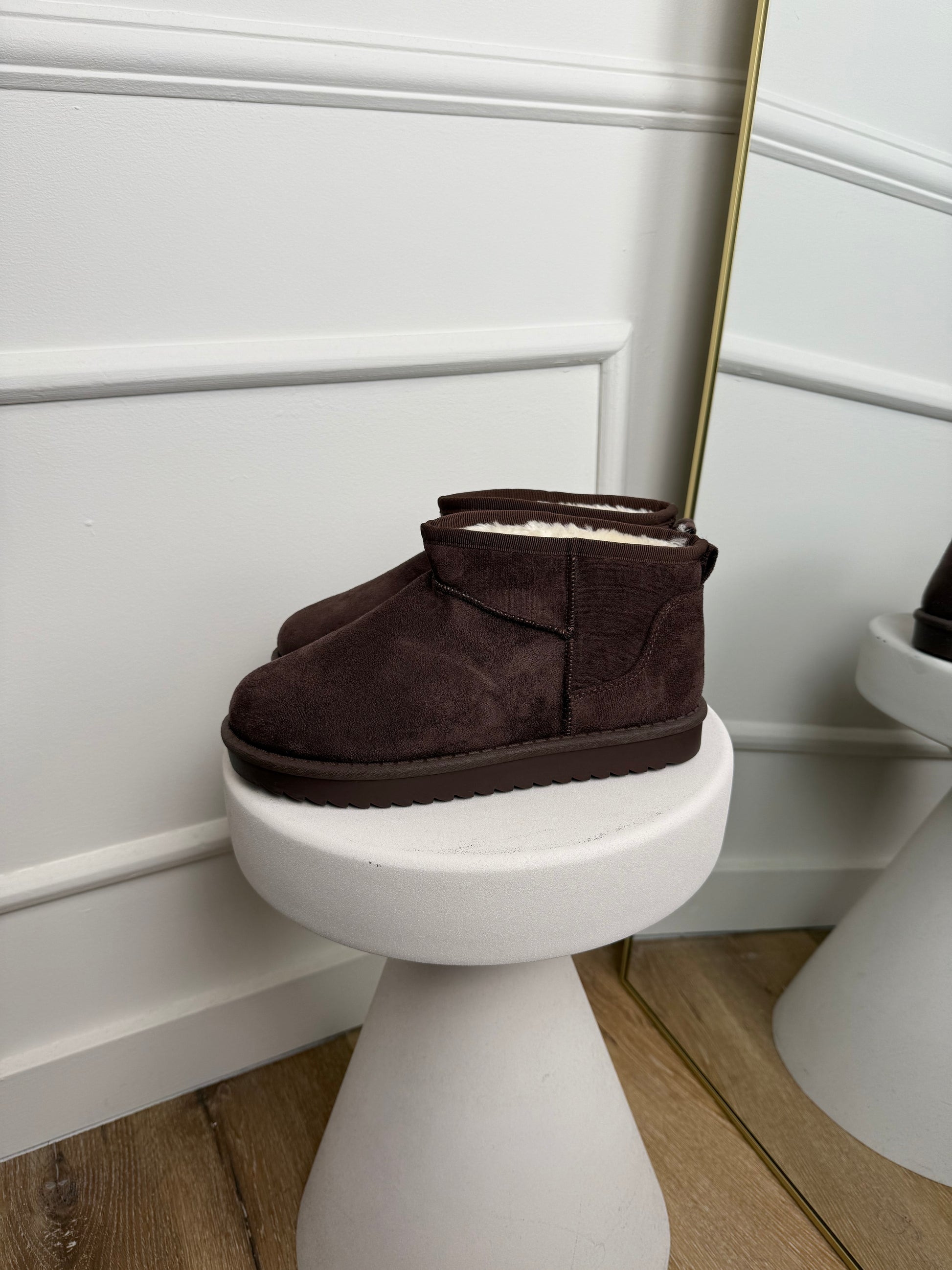 De binnenzijde van deze uggies zijn heerlijk warm en cosy, terwijl de buitenkant een tijdloze look geeft dankzij de suède donkerbruine look. Door het lage model zijn ze makkelijk aan te trekken en ideaal voor koude dagen.