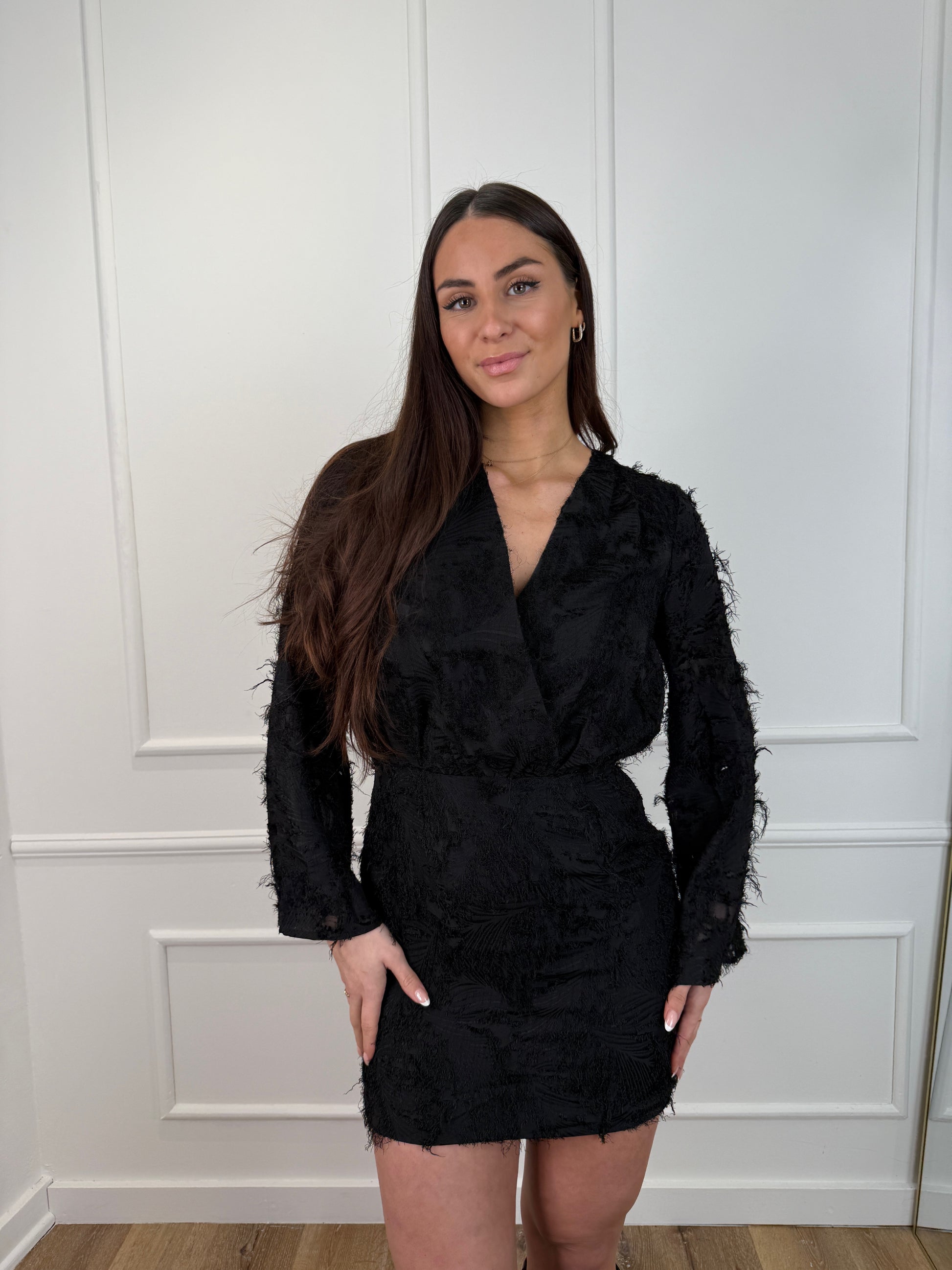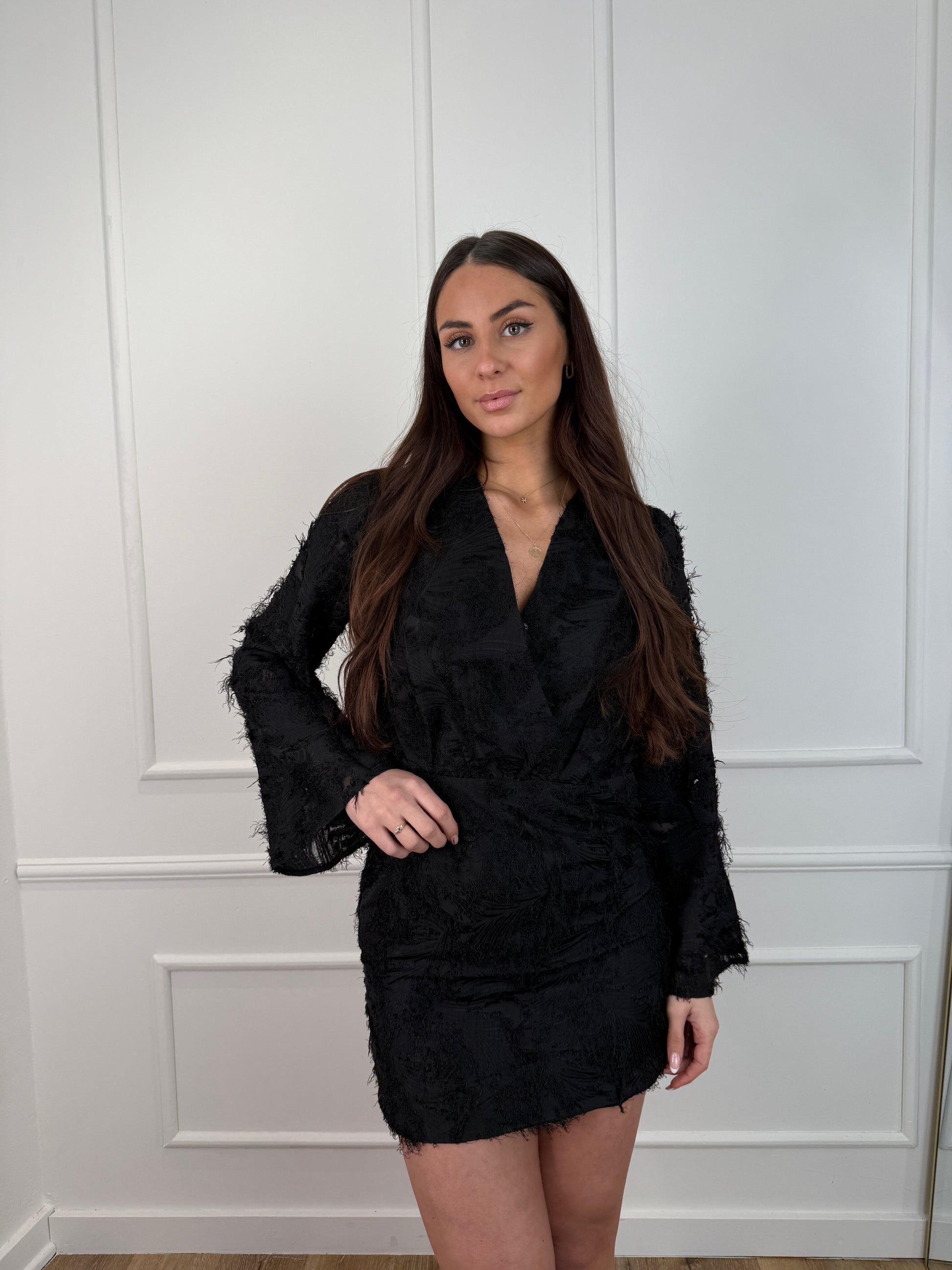 Prachtig zwart jurkje met wijde mouwen. Het rokje sluit mooi aan op het lichaam. Het jurkje bevat een rits aan de zijkant en een knoopsluiting bij de v-hals.