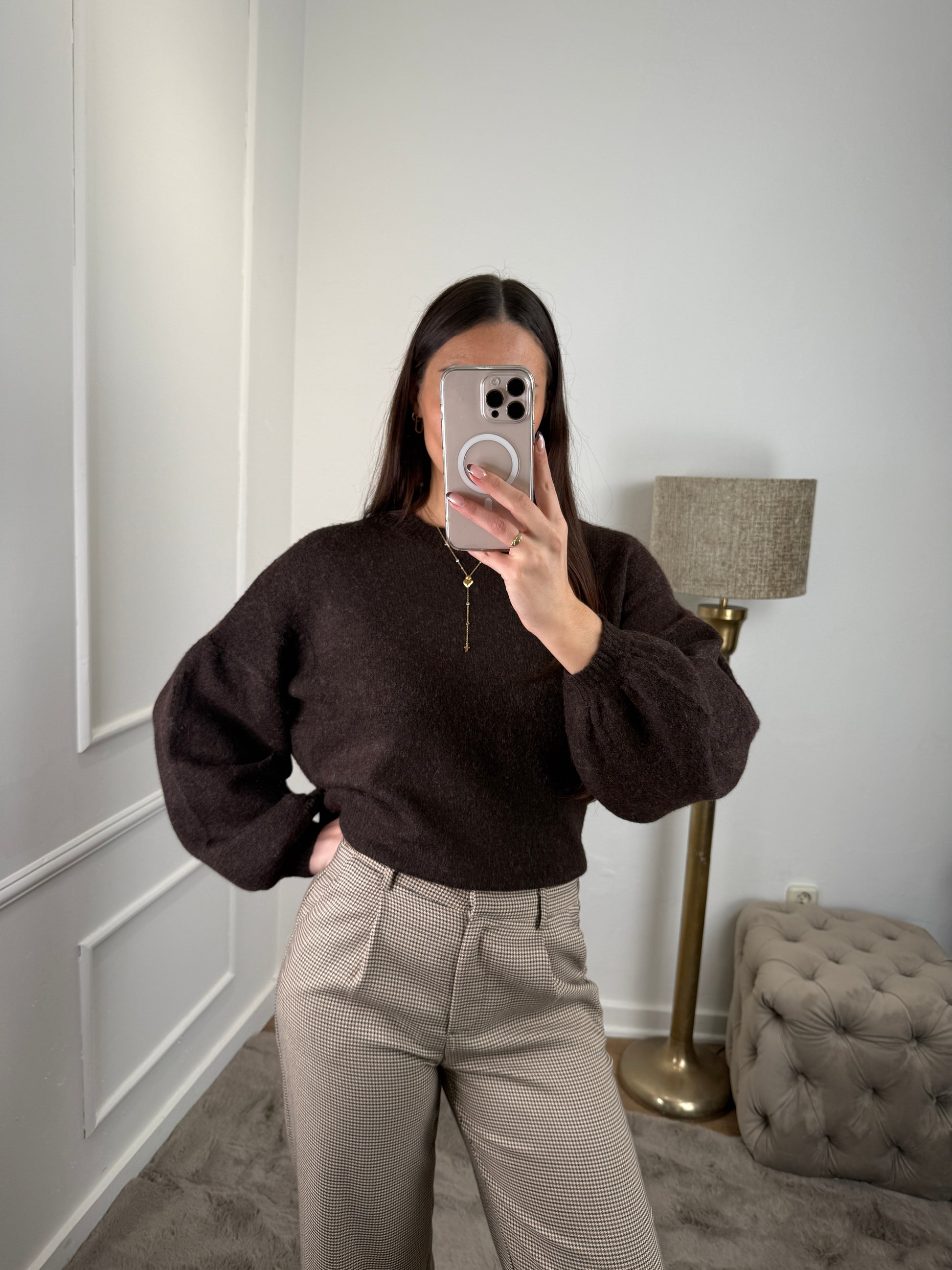 Heerlijk zachte trui met een ballonmouw, sluit mooi aan bij de taille. Verkrijgbaar in 3 kleuren.
