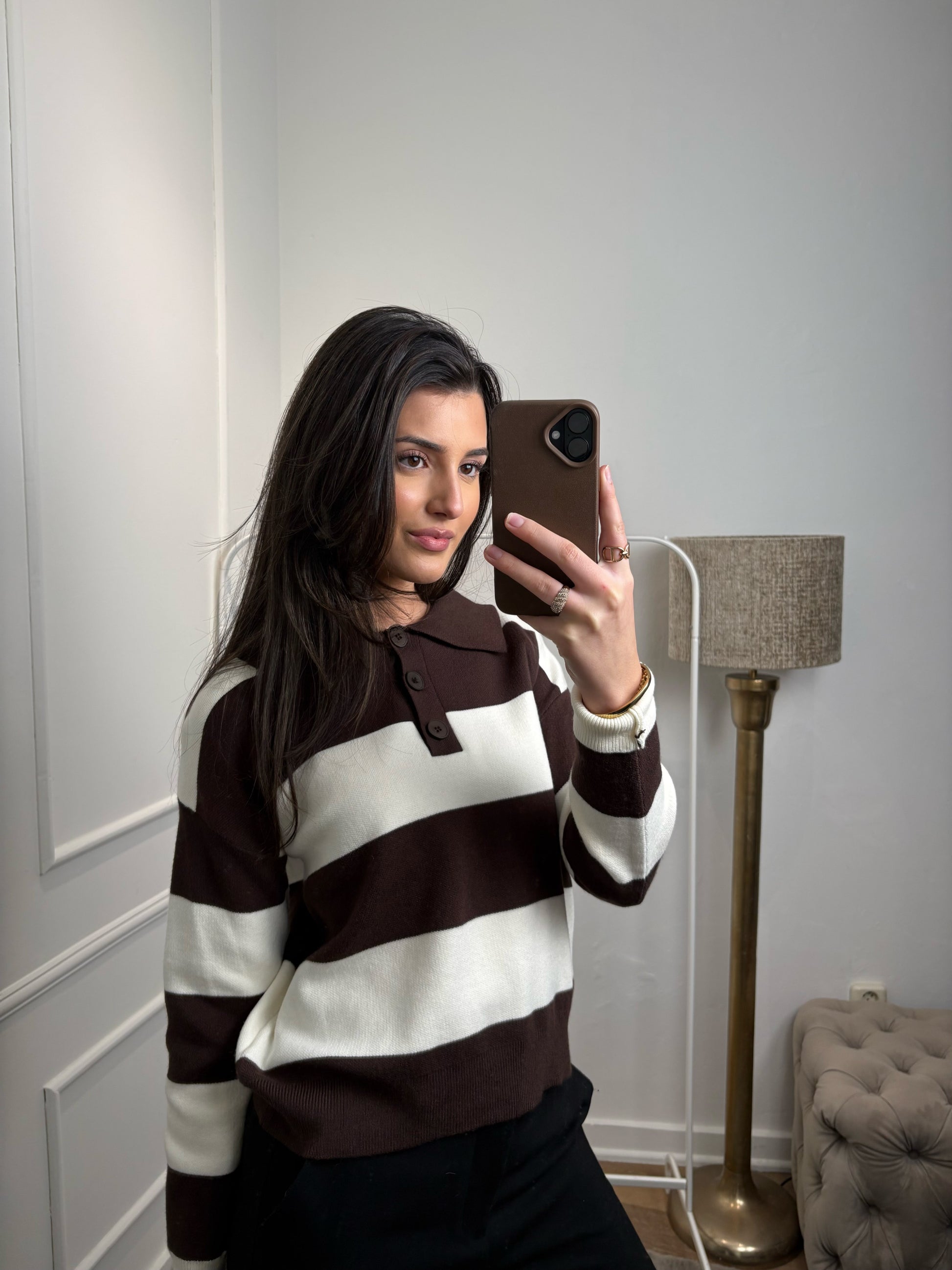 Trui met spreken, bruin en off-white. En een polokraag met knopen.